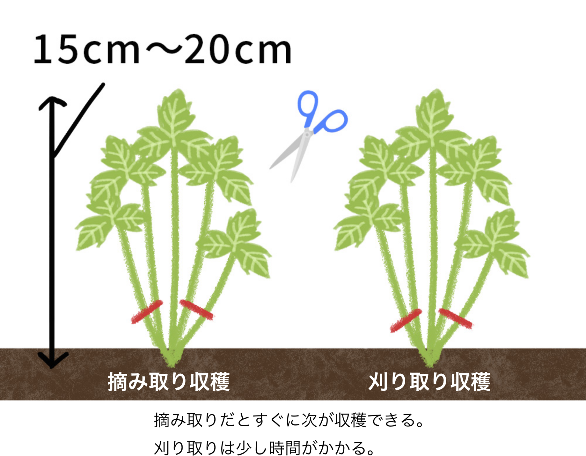 残った株からも再び芽が出てきて収穫ができます。収穫の時に一気にすべてを取らず、外側から少しずつ収穫すると、より早く新芽が出てきます。