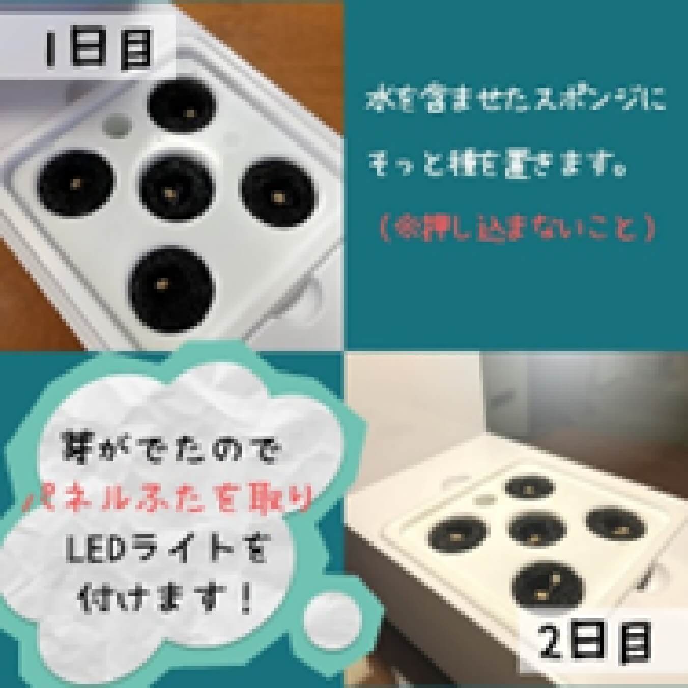 2日目:ふたを開けて様子を見てみると、すでに発芽していたため、ふたを全て外し、LEDライトをつけました。