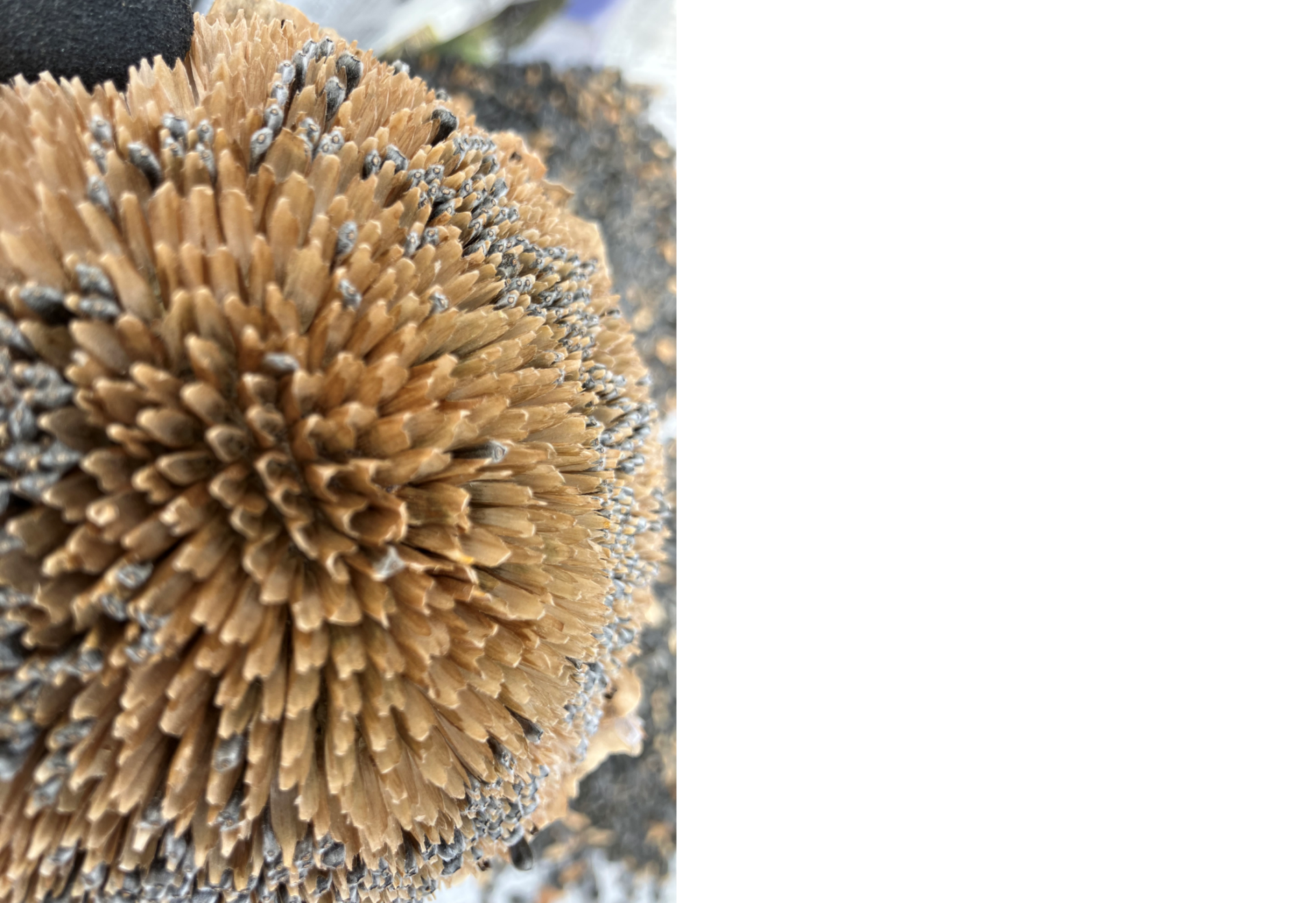 種は、大きな円盤状の花托と呼ばれる部分にくっついており、中身の詰まった種を落としていくと、その部分がよく見えるようになります。