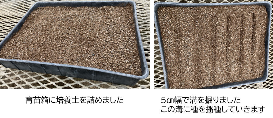 「絹てまり」は9月13日、「さつき」は9月27日にそれぞれ播種をしました。育苗箱に土を詰めた後、割りばしのような棒で筋を作って、そこに種をぱらぱらと筋まきにします。そのような筋を5㎝間隔に作って、育苗箱1枚で大体200~300粒の種をまくことができました。播種が終われば、種が隠れるぐらいに土をかぶせました。