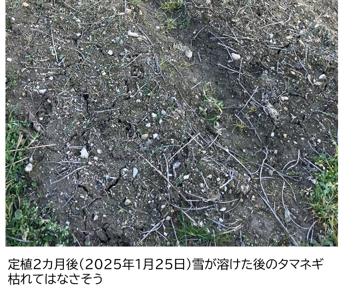 2025年1月11日には雪が降りました。今年は特に寒い年だということで、毎日凍えるほど寒いですが、雪が解けるとタマネギは枯れずに残っていました。少し太くなったような気がします。