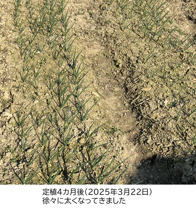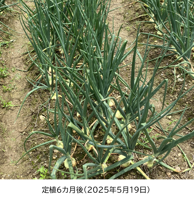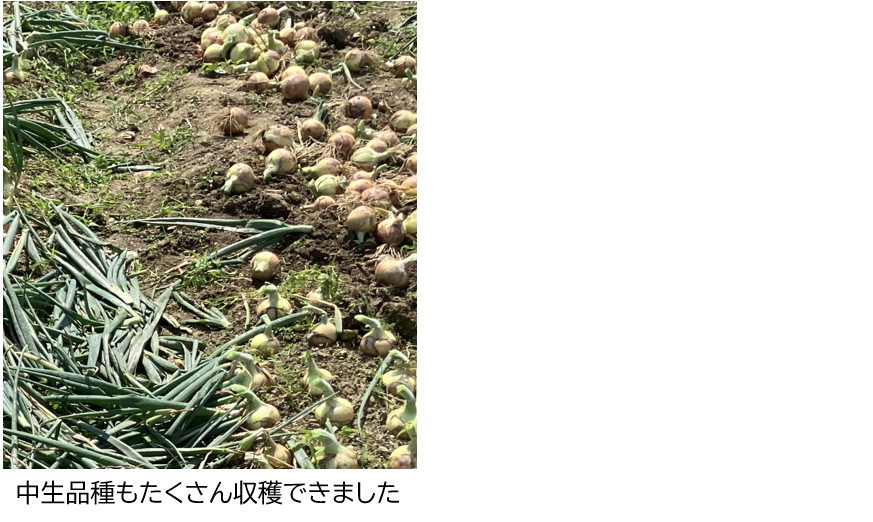 中生品種も5月になり、玉(鱗茎部)が太ってきました。べと病やアザミウマ防除を適度に実施し、6月には無事収穫できました。枯れている株はほとんどなかったようです。