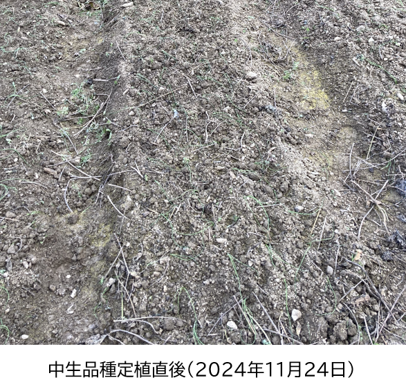 苗は株間15㎝で等間隔に植えました(写真)。極早生品種は11月10日に、中生品種は11月24日に定植しています。苗が細くて写真ではどこに植わっているか見えにくいですね。これからは春まで定期的に観察していくことにします。