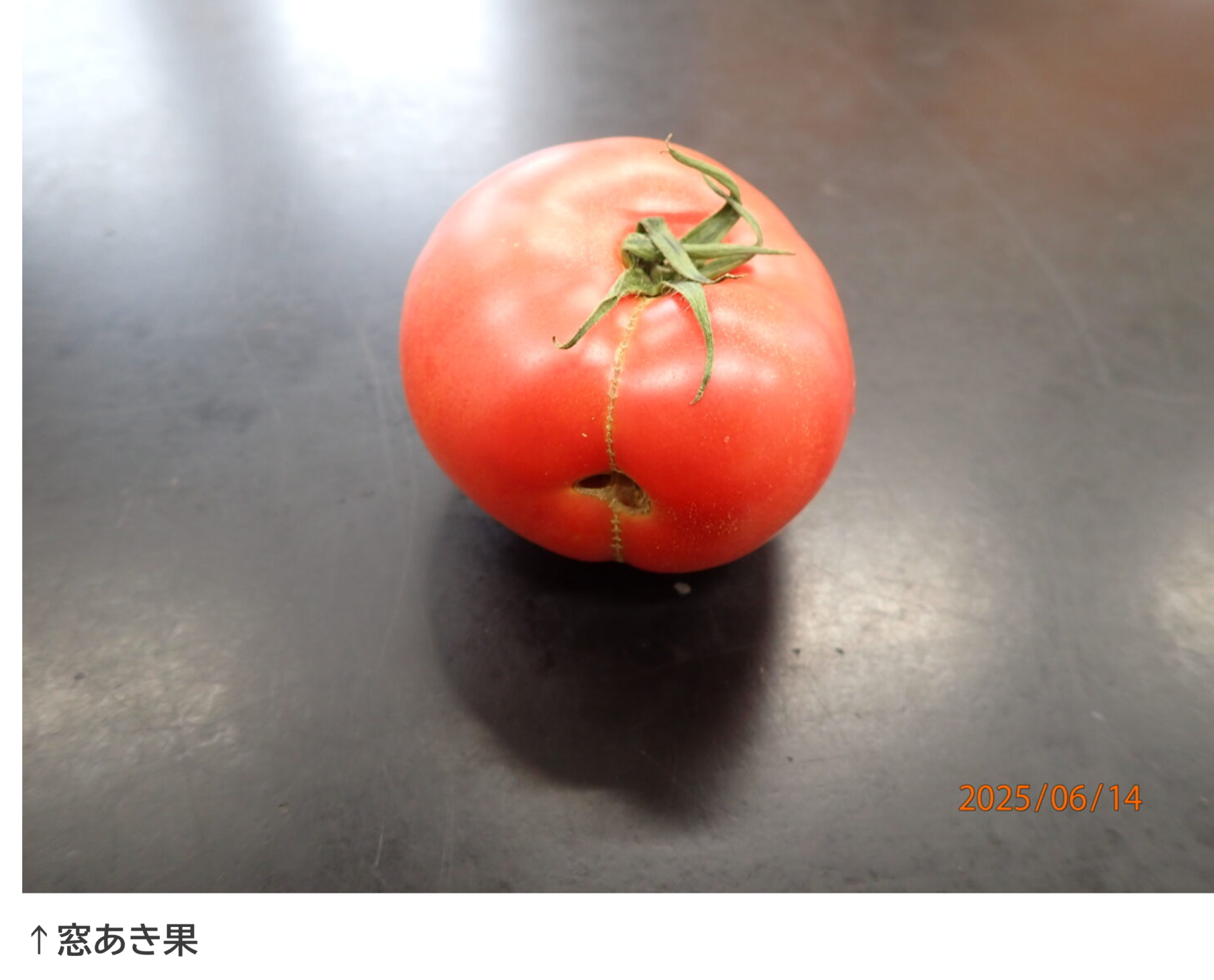 さて、ブログの内容ですが、前回は、放射状裂果、同心円状裂果、チャック果、花落ち果、空洞果を紹介しました。今回も引き続きトマトの不良果について紹介します。