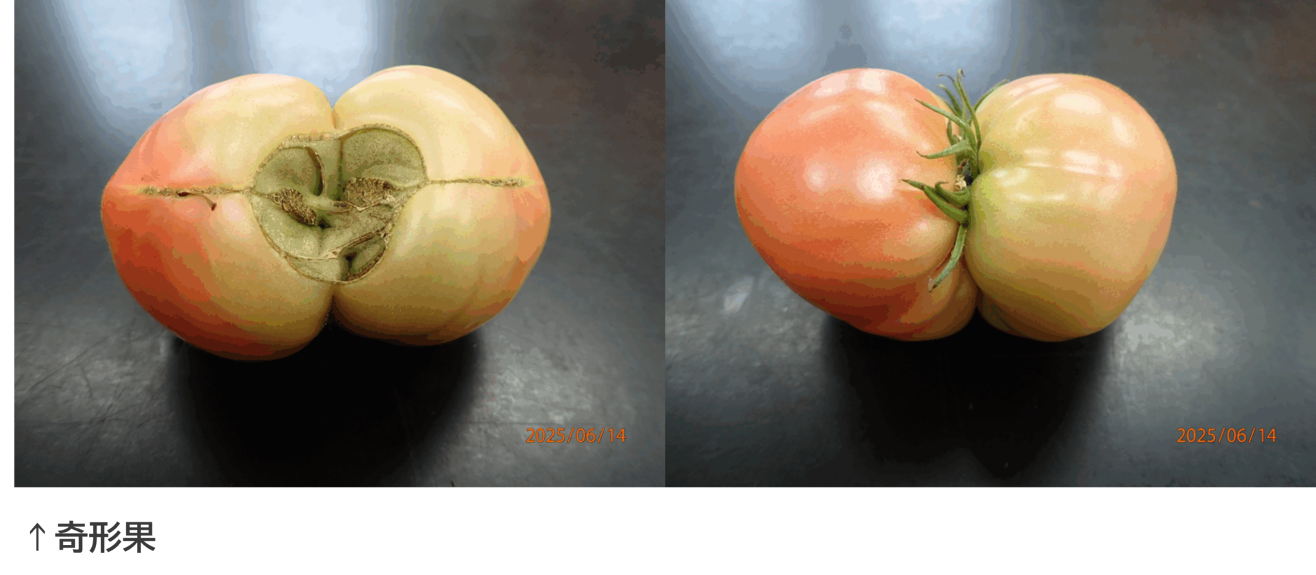 奇形のもので判別が難しいものをまとめて呼んでいます。現象としてはチャック果、窓あき果に近かったり、花落ち果で紹介した花芽分化期の異常により、子房の心皮数や子室数が増加などが起きていると思います。