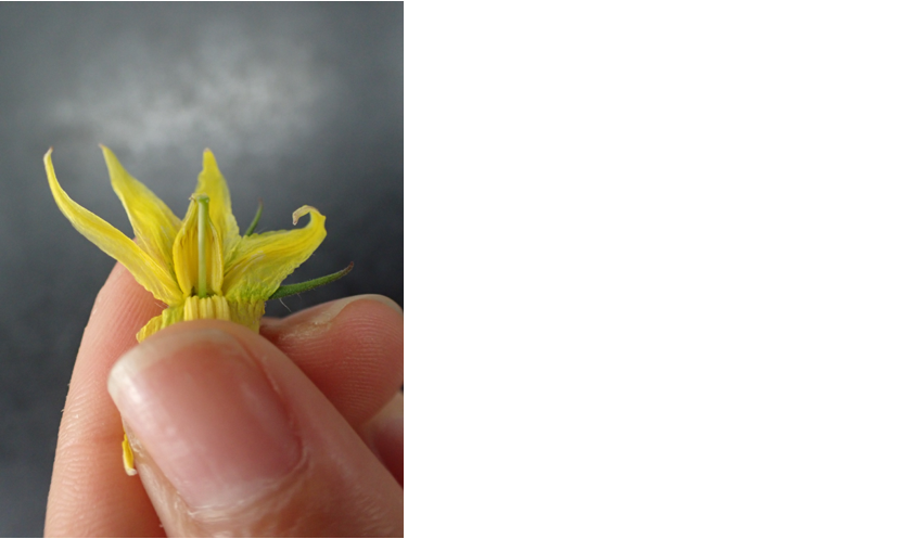 トマトは一般に自家受粉をおこない、開花の際には、葯が開き花粉が放出されると同時に、花柱が伸長することで受粉をします。