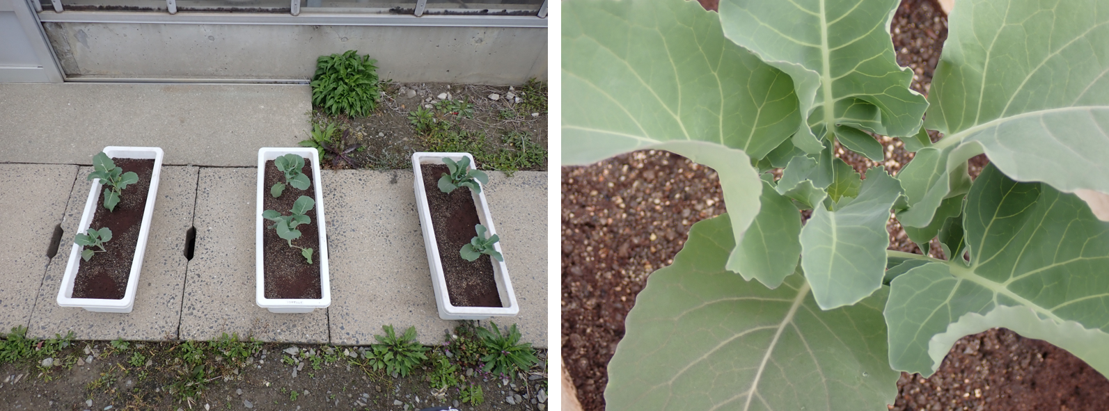 茎ブロッコリーの苗をプランターに2株ずつ定植しました。