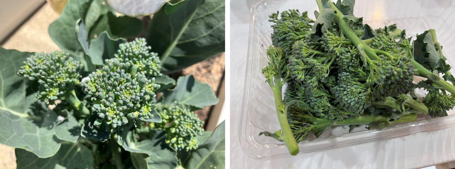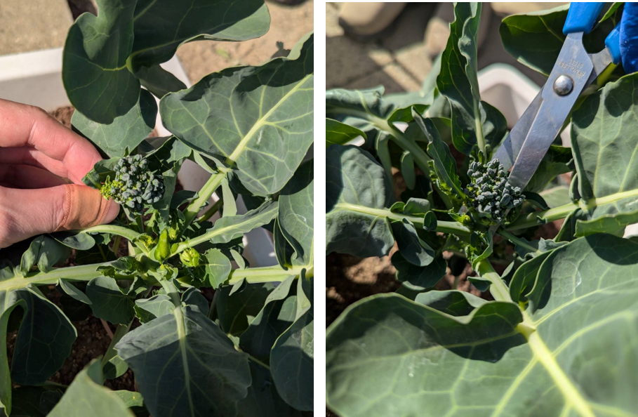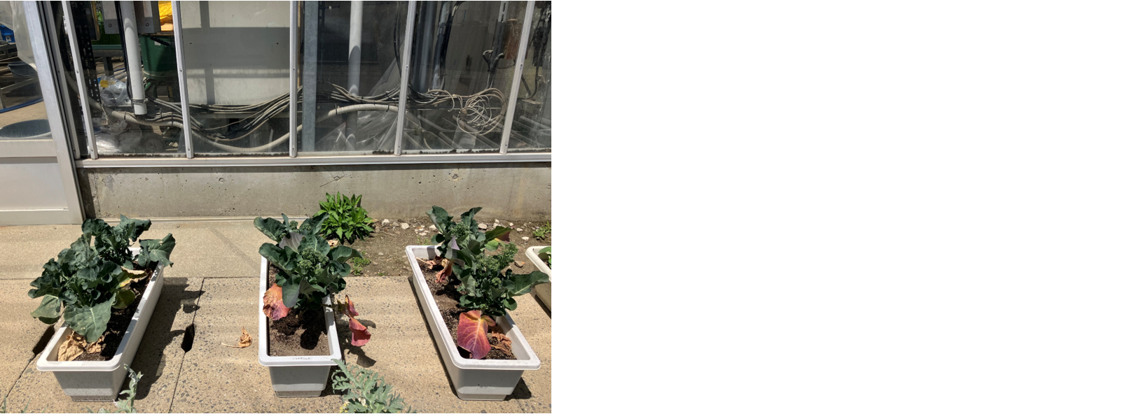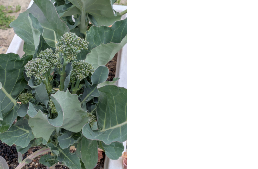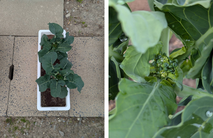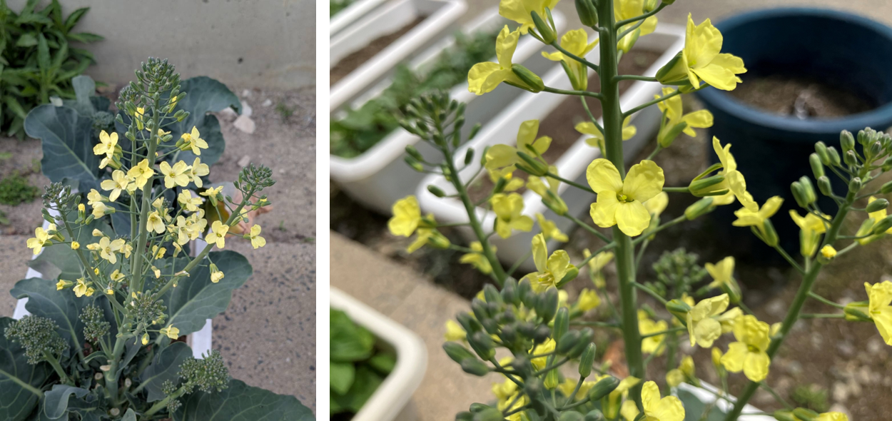 油断していると、右側2プランターの茎ブロッコリーは花が咲きそうな色合いとなってきていたため、収穫を行いました。
