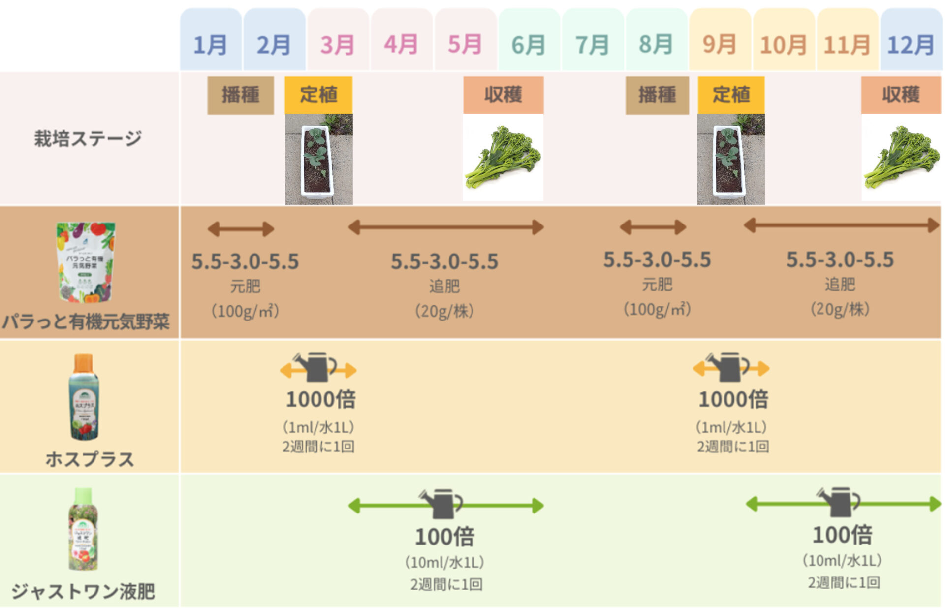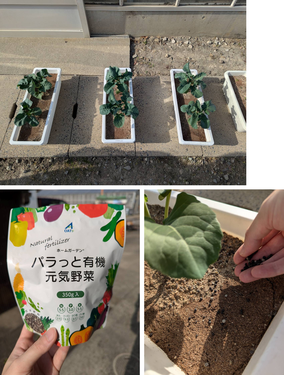 定植してから2回りほど大きくなったので、様子を見て約5g/株ほどパラっと有機元気野菜を追肥しました。