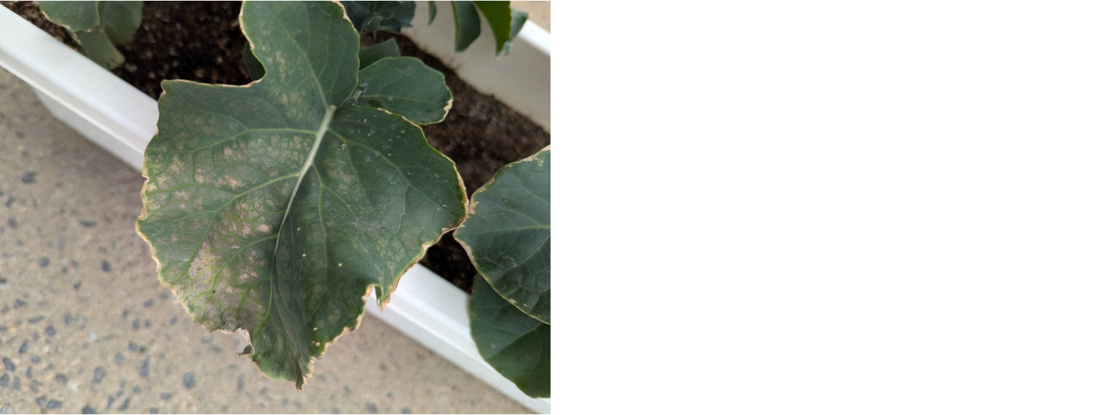 肥料を他の区より多くあたえた茎ブロッコリーを見てみると、最初は他のプランターと様子が変わらなかったのですが、ここにきて下の方の葉の縁と内側に黄化や褐変がみられてきました。