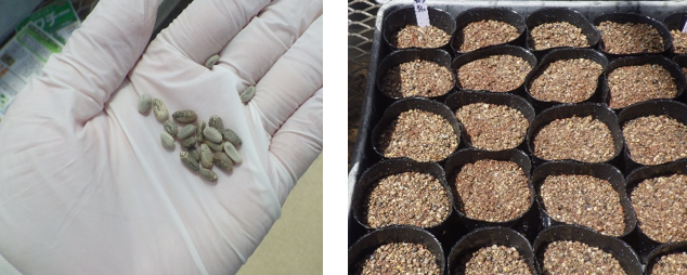 今回は種の数もあまり多くなかったので、ポットに1粒ずつ播種しました。