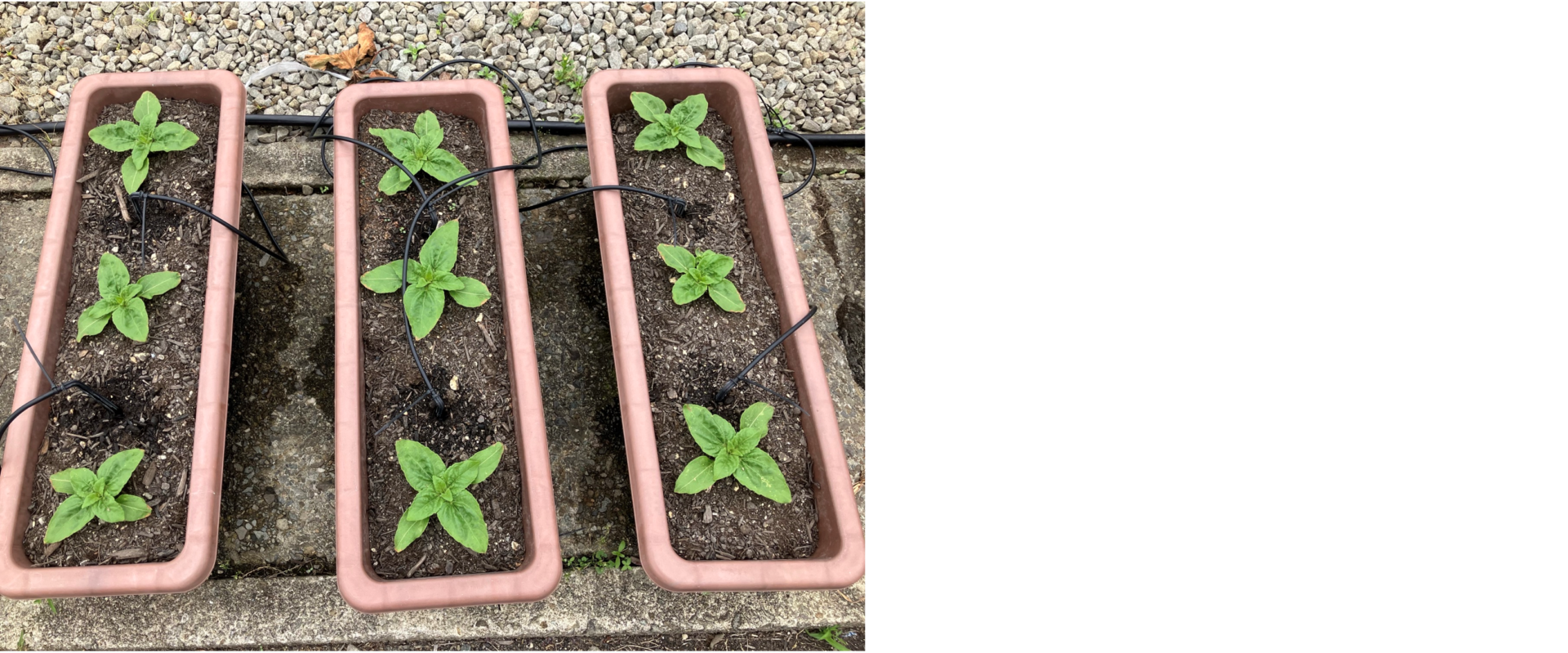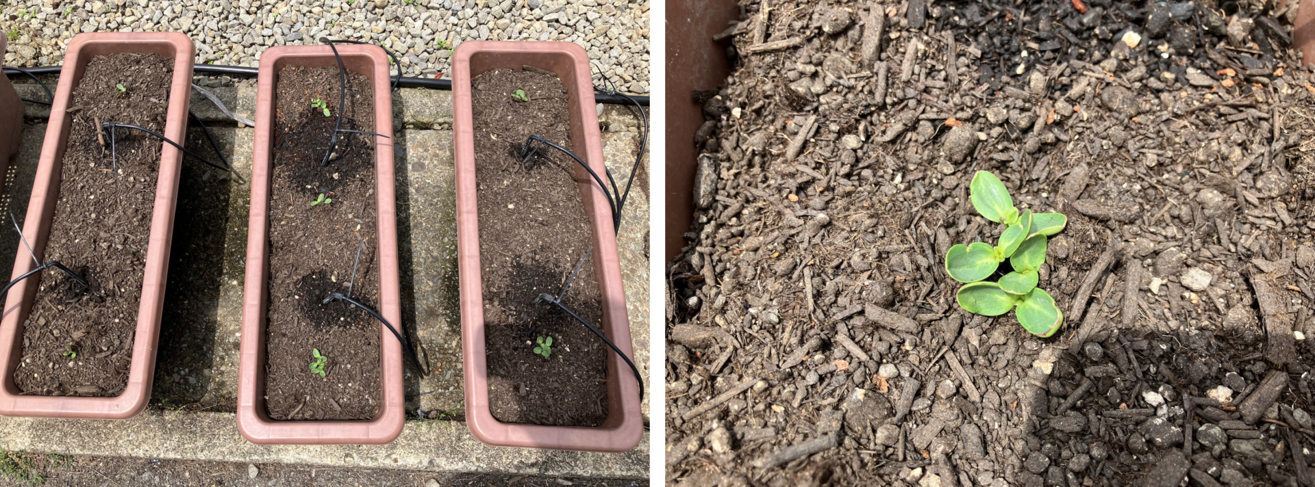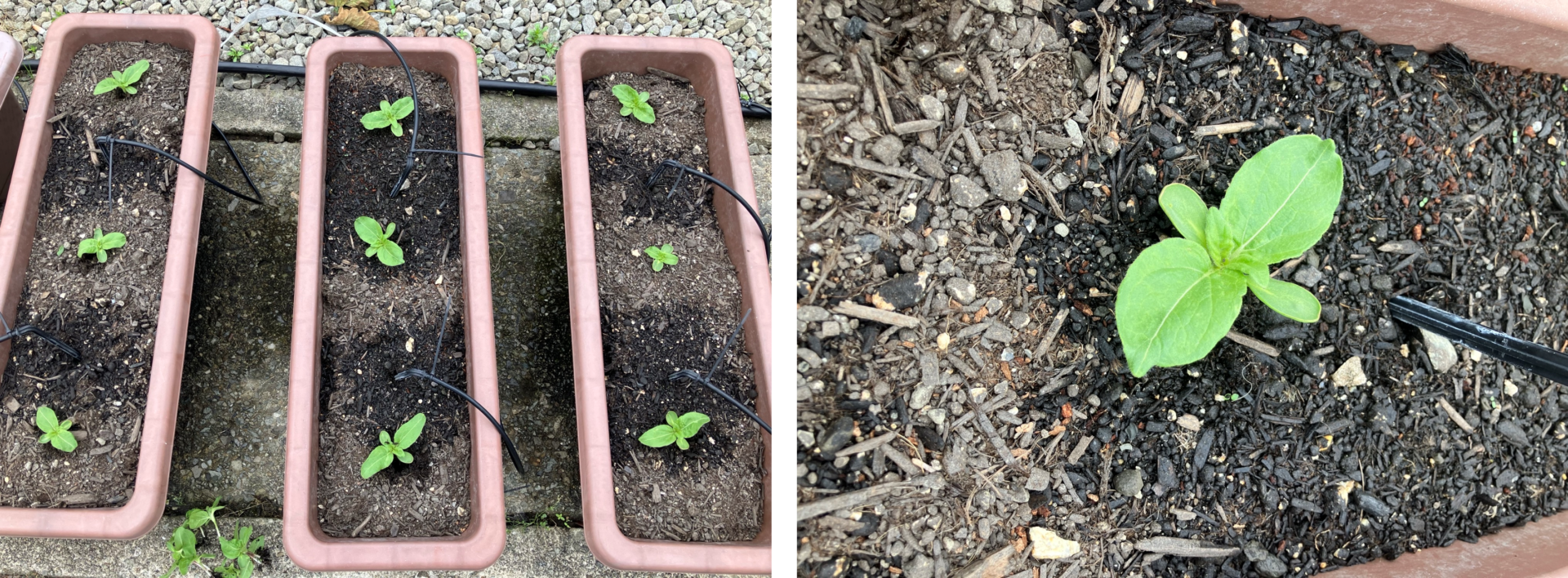 発芽して少し生長し、混み合ってきたので、間引きを行いました。水やりは水道に自動かん水装置を設置し、ドリッパーを用いて株元に自動で水が行くようにしています。写真に写っている黒いチューブがそれです。