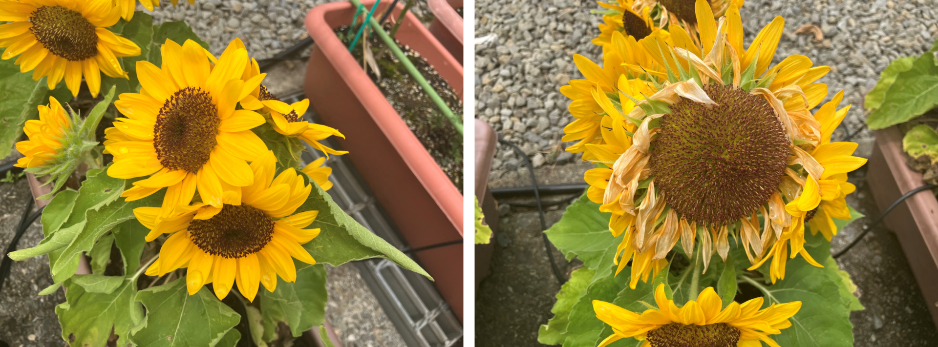 ちなみに、前回摘芯したヒマワリの花は部屋につるしてドライフラワーにしてみました。