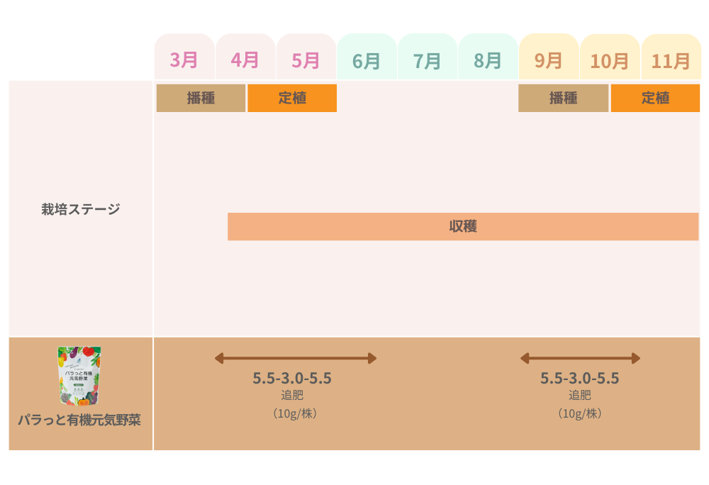 肥料を多くは必要としませんが、株を充実させたい時などは、春や秋の生育が旺盛な時期に追肥として10g/株のパラっと有機元気野菜をあたえましょう。月1回程度が目安です。