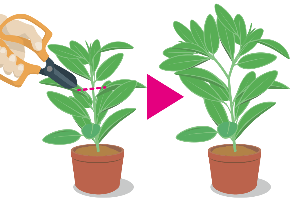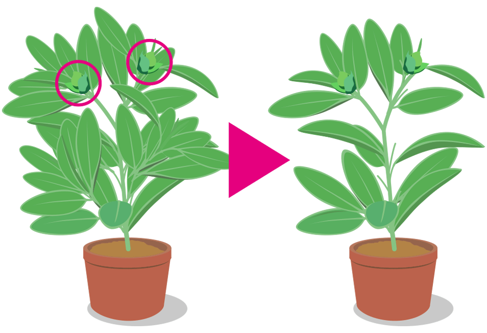 摘芯を繰り返して茎の数が増えると、混み合って病気や害虫の原因となってしまいます。花芽が見える時期に不要な枝を半分から3分の2程度剪定します。わき芽を残しつつ、混み合っている部分の枝を剪定しましょう。