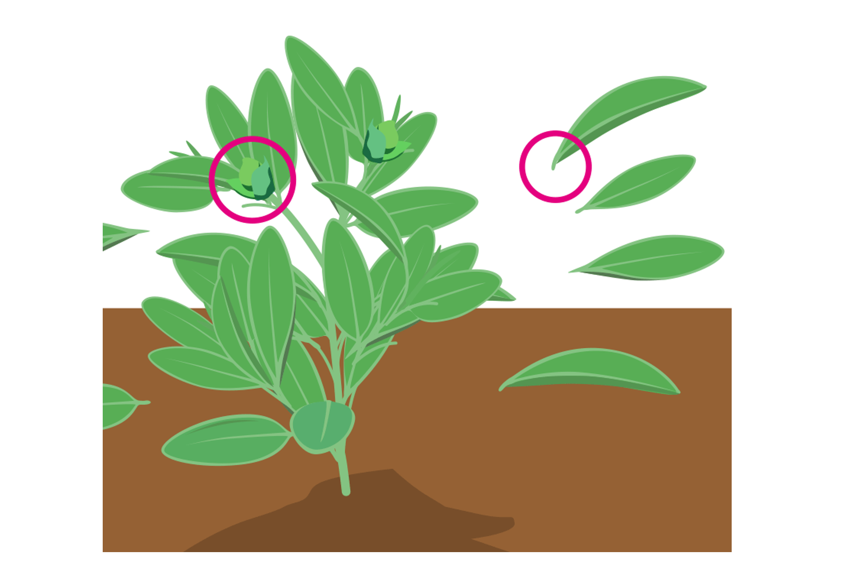 セージの葉は4~11月の長い期間収穫することができます。若い葉を付け根から摘み取ります。花が咲いてしまうと葉が固くなったり、香りが落ちたりするため、開花前に花を摘み取ることで葉を長く楽しむことができます。
