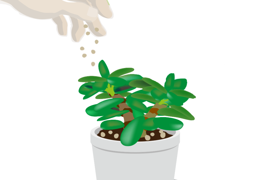 観葉植物用の緩効性の粒状肥料の場合、2カ月に1回程度あたえます。即効性の液体肥料の場合は、10日に1回程度が目安です。真夏や冬にはあたえないようにしましょう。 -