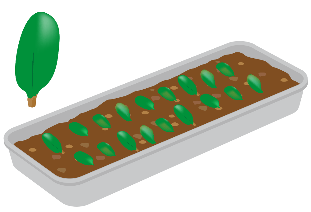 時期は生長期である5~8月頃がオススメ。枝から元気な葉を、根元を潰さないように取り、切り口を乾燥させてから挿し木用の土に並べておきます。水をあたえないまま1カ月ほど管理すると小さな芽が出てきますので、ある程度生長したら、新しい土を入れた鉢植えに植え付けるようにします。