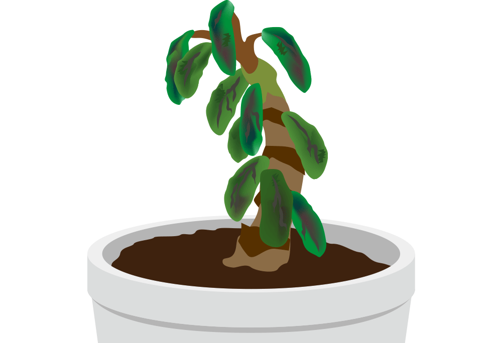 日光不足、寒さ、水のあたえすぎなどが原因として考えられます。水のあたえすぎによる根腐れの場合は、すぐに鉢から出して根の状態を確認し、生きている部分で植え替えを行うようにしてください。