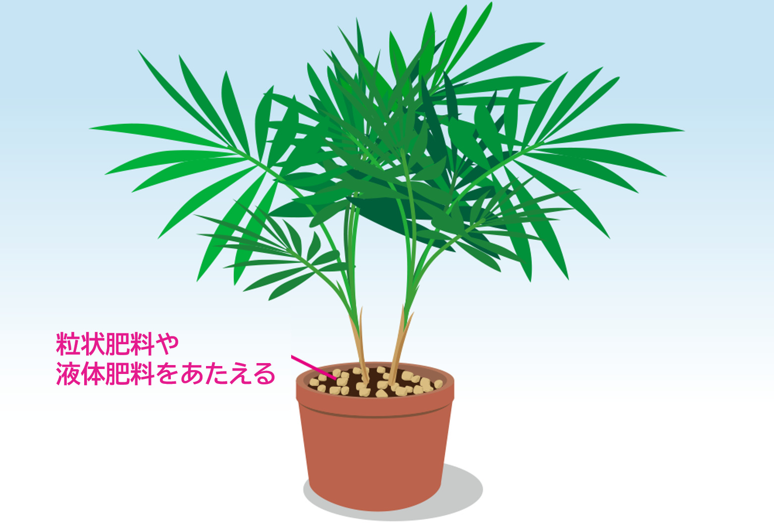観葉植物用の緩効性の粒状肥料の場合、2カ月に1回程度あたえます。即効性の液体肥料の場合は、10日に1回程度が目安です。