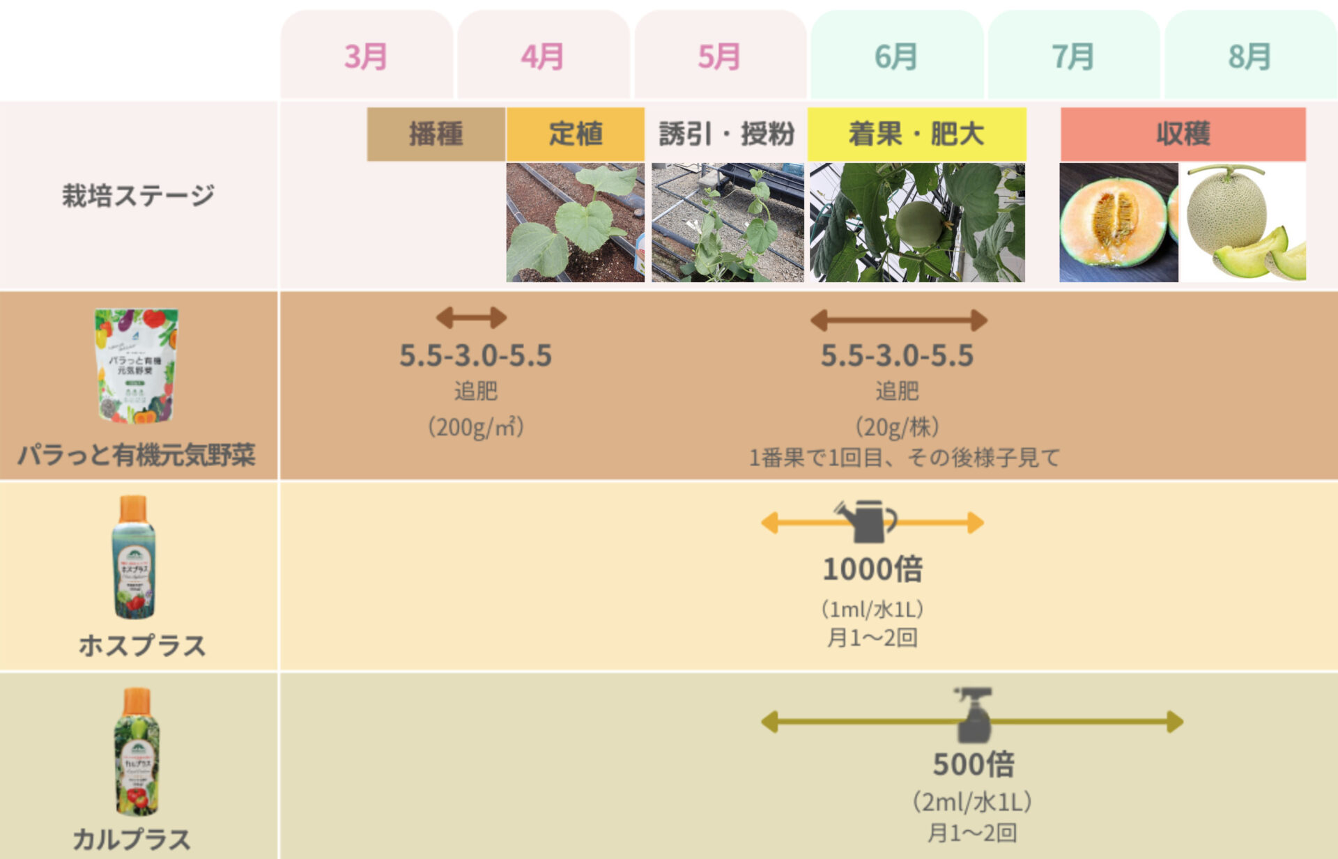 露地栽培の場合は、定植2週間前に苦土石灰をまいて耕し、定植1週間前にはパラっと有機元気野菜を200 g/m²まいて耕し、畝をたてます。メロンは高温・乾燥を好むため、トンネルやマルチをしておくと、地温を上昇させ土壌中の水分が過多にならないように対策が出来ます。プランター・鉢栽培は、深さと高さが十分にあるものを選び、プランター・鉢の8割くらいまで野菜用の培養土を詰めます。