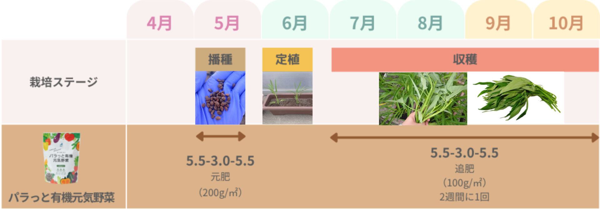 クウシンサイは乾燥に弱く、日中の暑い時間帯に収穫を行うと萎れてしまいます。一番収穫に良い時間帯は早朝か温度が落ちた夜ですが、日中に収穫したい場合は、大きめの袋の中にスプレーで水を吹きかけ、高湿度にした袋の中に収穫物をすぐに入れると新鮮なまま収穫が可能です。