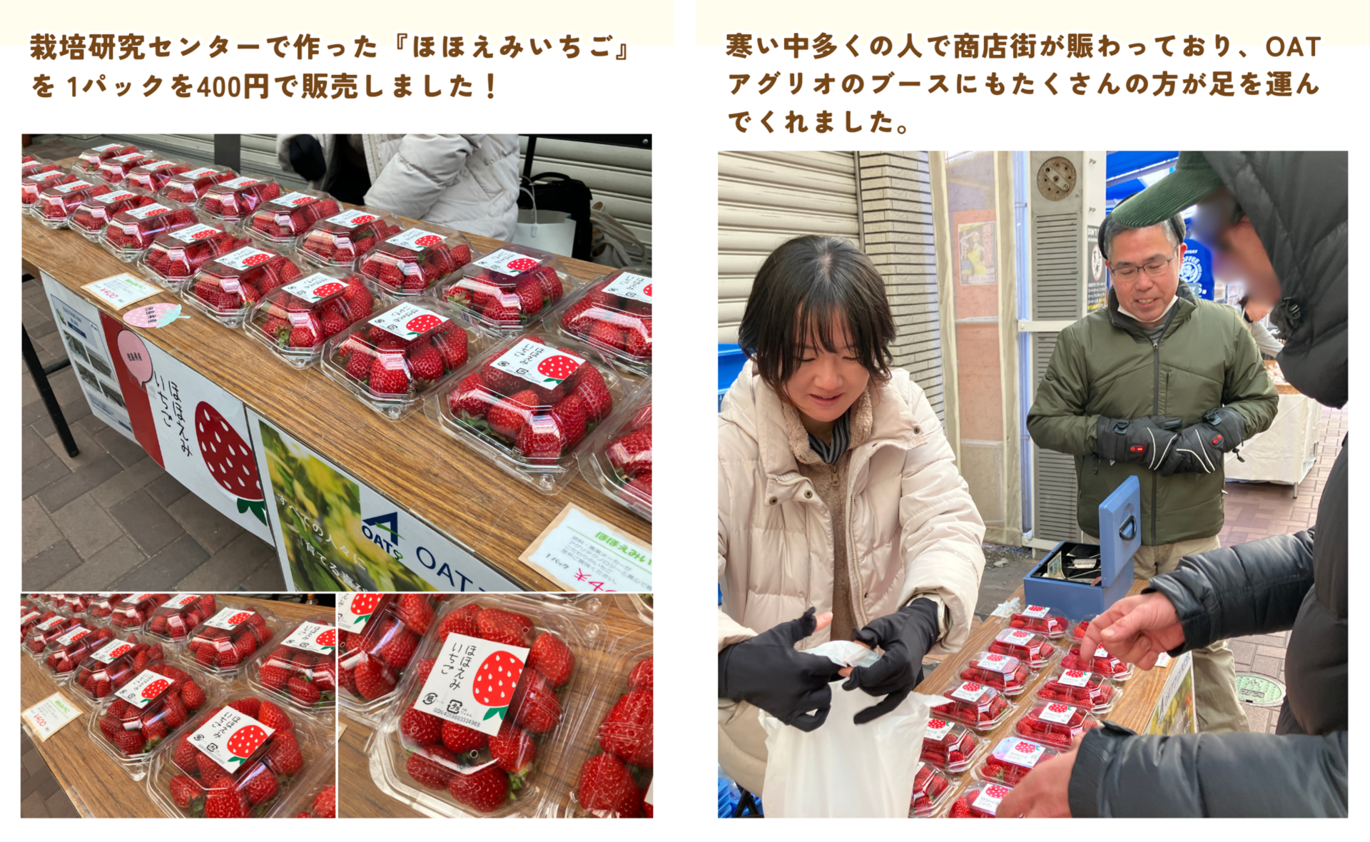 そのような中、同日に近隣の東新町商店街で開催されていた「徳島クプマルシェ」に急遽出店させていただき、OATアグリオのブースにて、栽培研究センターで育てた「ほほえみいちご」を販売しました。