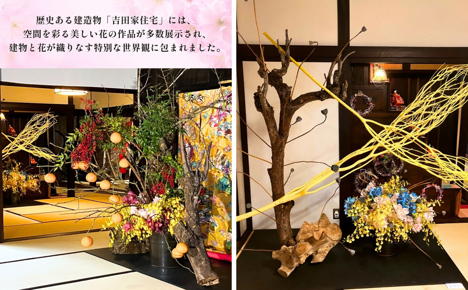 歴史ある建造物「吉田家住宅」には、空間を彩る美しい花の作品が数多く展示され、建物と花が織りなす特別な世界観に包まれました。