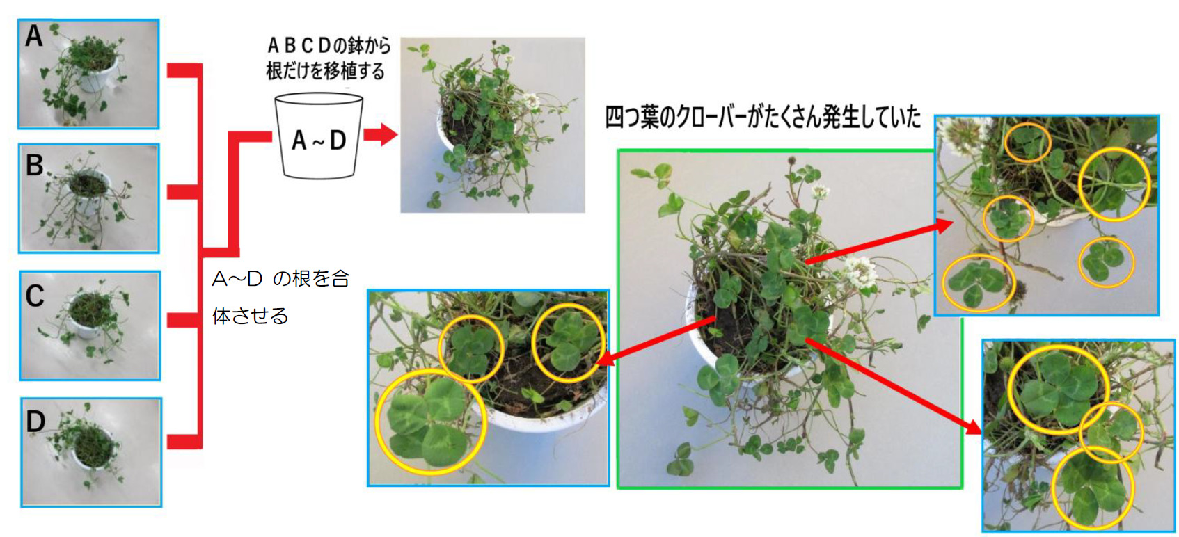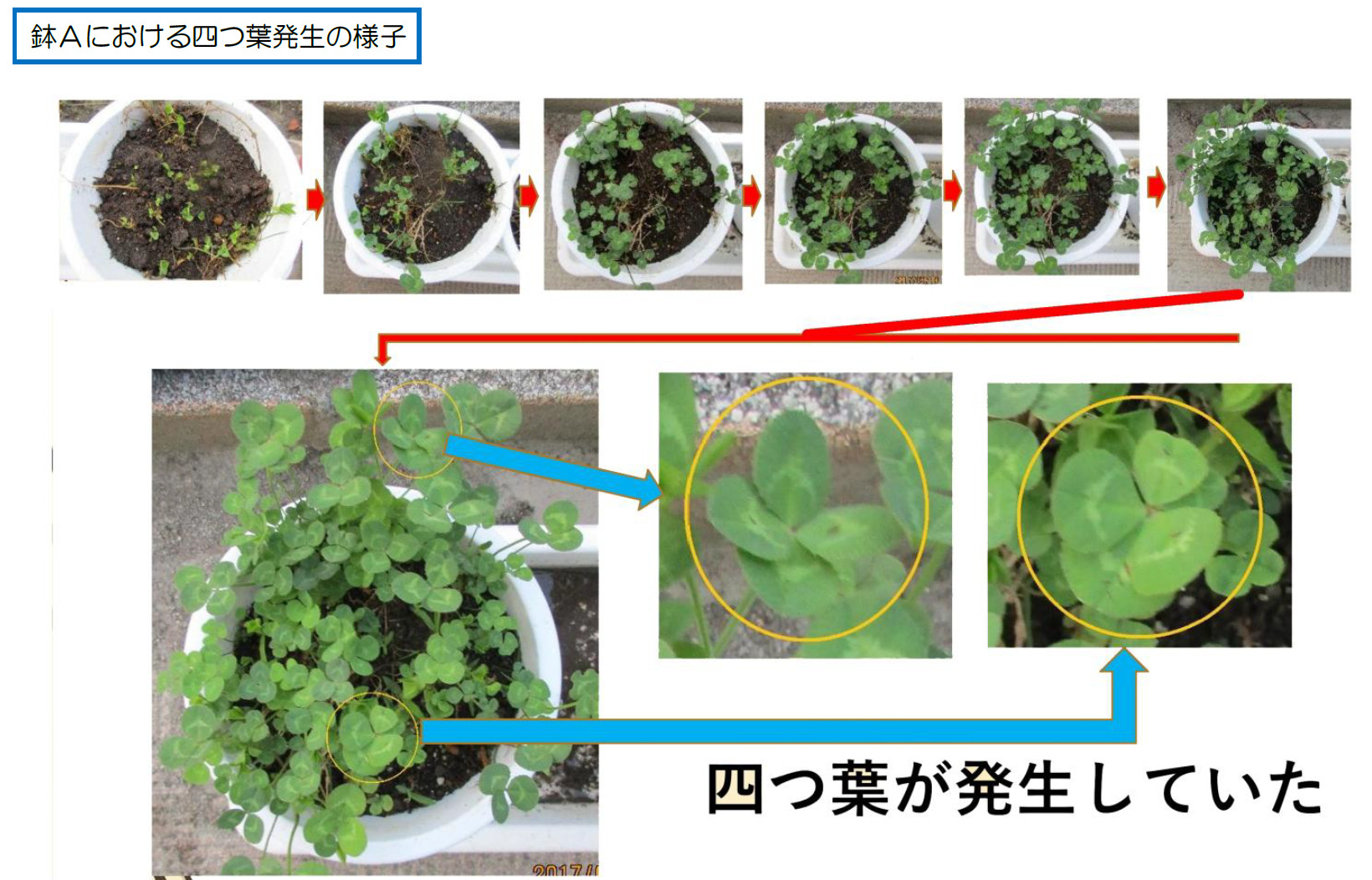 四つ葉のクローバーが発生しやすい群落から採取した根から育てたクローバーは、通常よりとても高い確率で四つ葉になることが分かった。