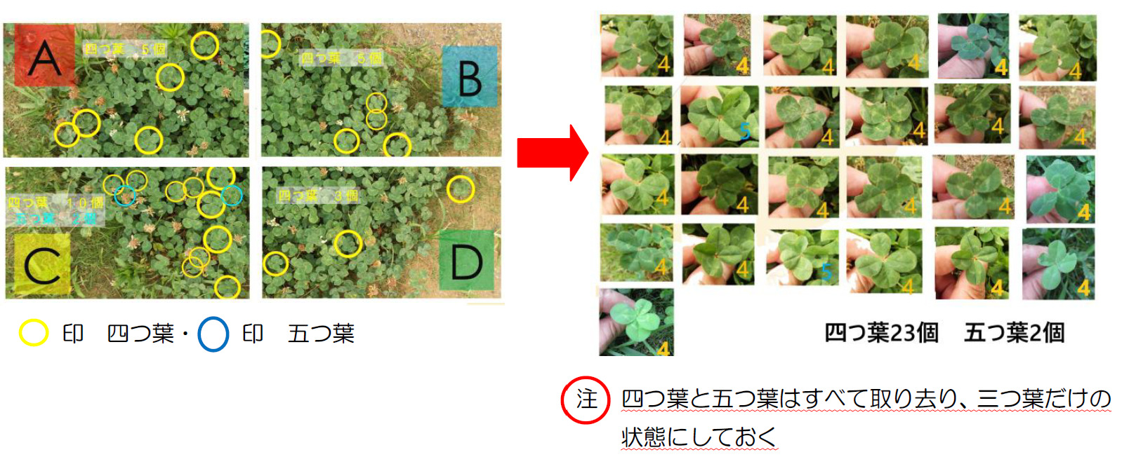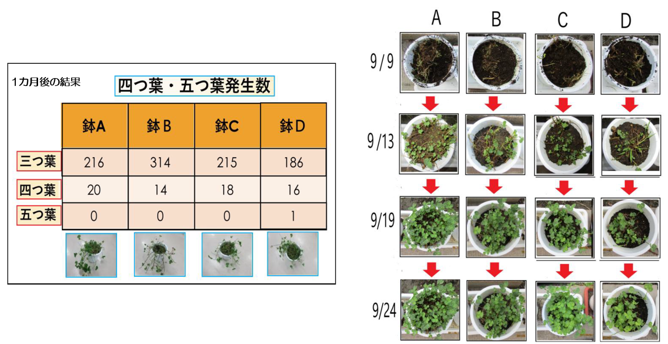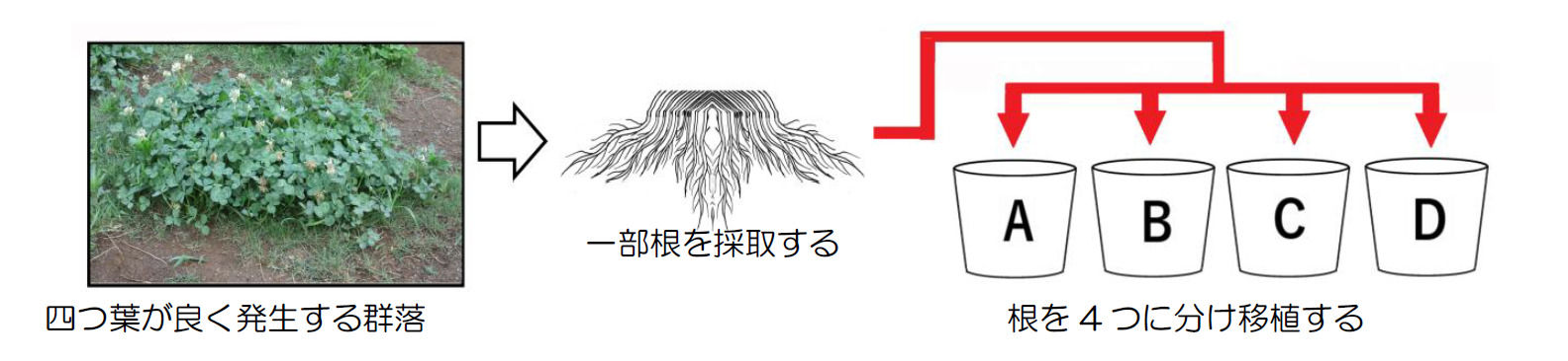 四つ葉のクローバーが良く発生する群落からシロツメクサの根を採取し、その根を4つの植木鉢に移植しシロツメクサを育て、四つ葉が発生するかどうかを観察する。