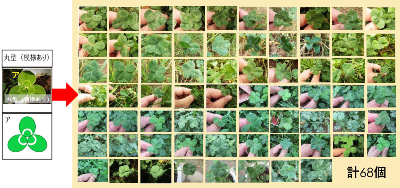 丸型(模様あり)のものが圧倒的に多いということが分かった。その反面葉が細長いタイプのものに四つ葉は見られなかった。理由は分からないが、葉の形状・模様と四つ葉の発生には何か関連があるものと考えられる。