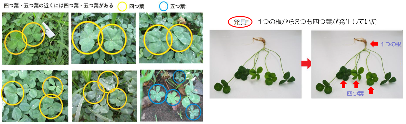 四つ葉・五つ葉を全部取り去ったにも関わらず、1カ月後には新たにたくさんの四つ葉が発生していた。シロツメクサの群落により四つ葉が発生しやすい群落と、発生しにくい群落があると考えられる。