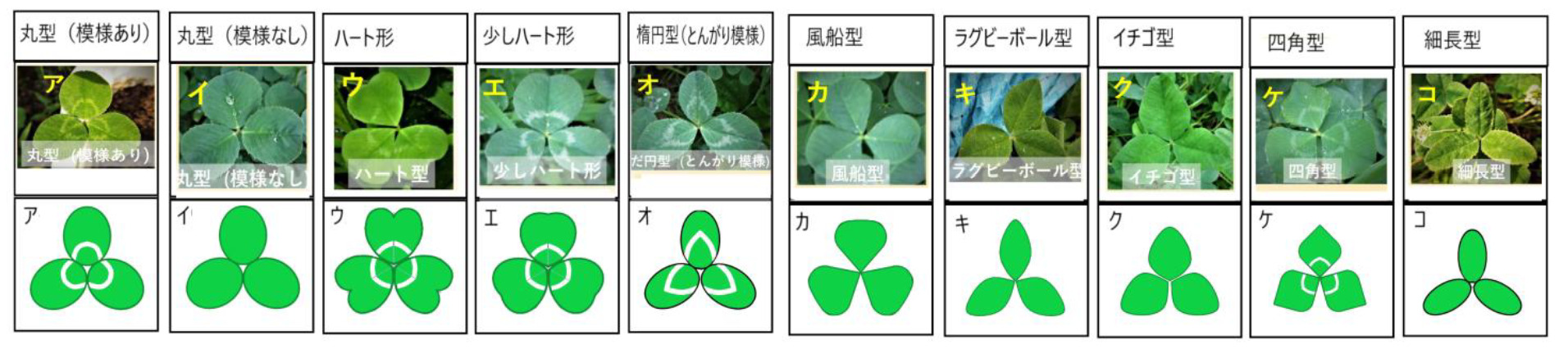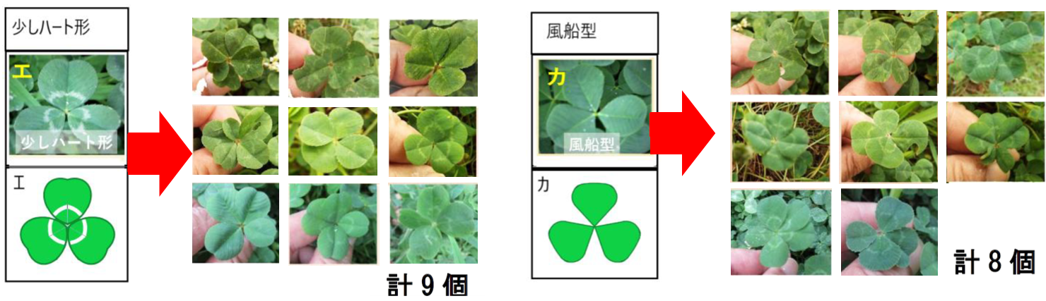 ⑤ クローバーの葉の形状と模様を観察すると、微妙に違いがあり。全部で10種類に分類できた。