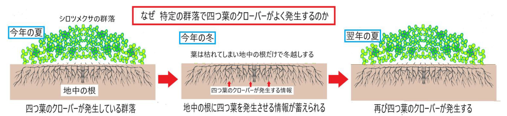 四つ葉のクローバーはとても珍しいものだが、四つ葉の近くに四つ葉が見つかることが多いことから、四つ葉の根に四つ葉を発生させるような情報が蓄えられているのではないかと考えられる。
