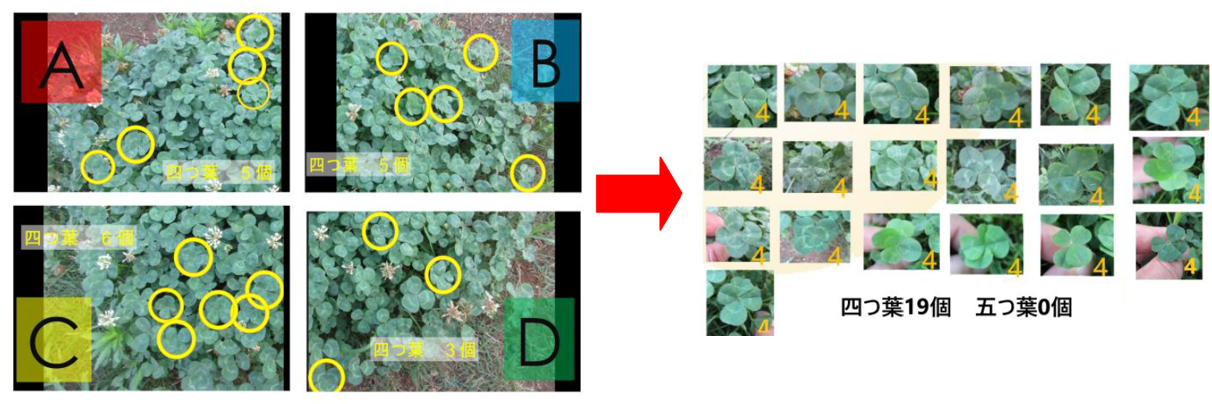 高い確率で四つ葉・五つ葉を見つけることができた。