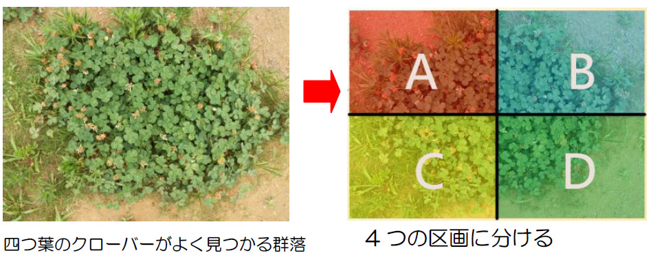 シロツメクサがたくさん生息する公園内で、特に四つ葉が多く発生する群落に着目し、写真のように4つに分割して、それぞれの四つ葉の発生状況を調べる。