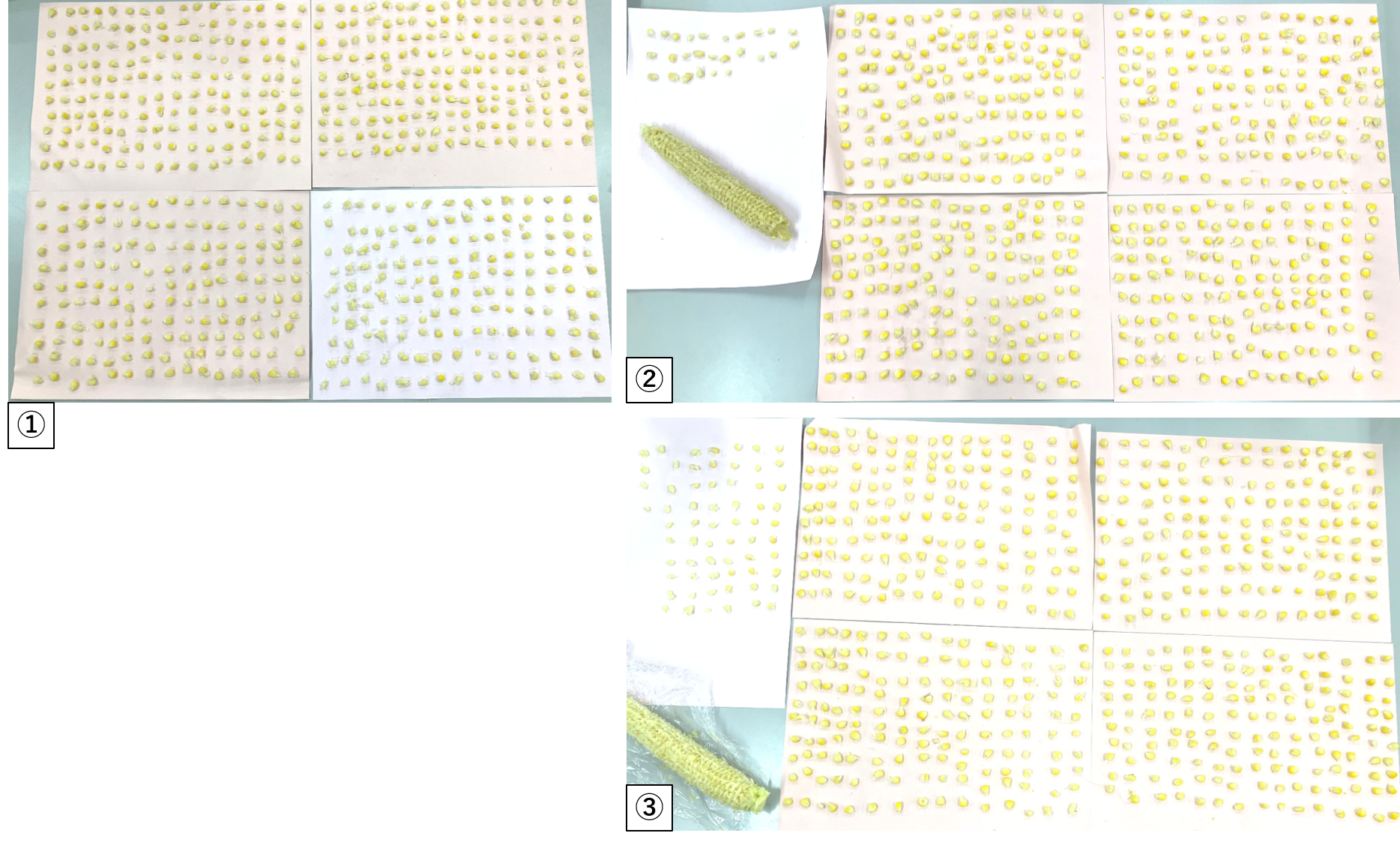 3本とも、確かに全て偶数であるのと同時に、粒の数もおおむね同じで、農家さんが均一で高品質なトウモロコシを生産されていることを実感しました。