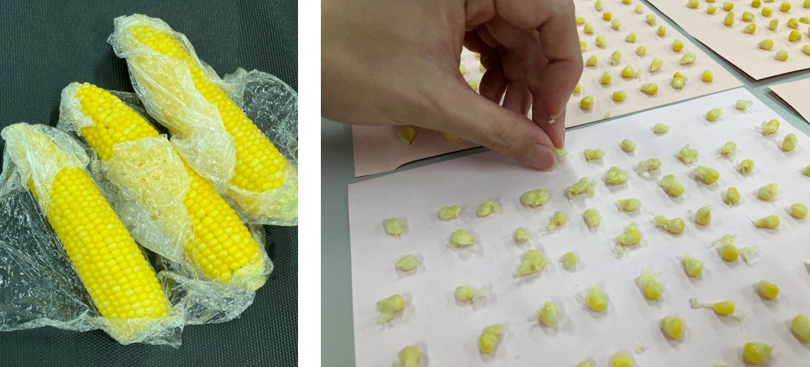 3本のトウモロコシの長さや直径を測った後、粒を厚紙に縦10粒ずつ並べていきました。