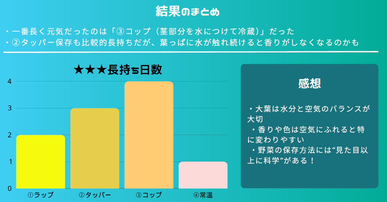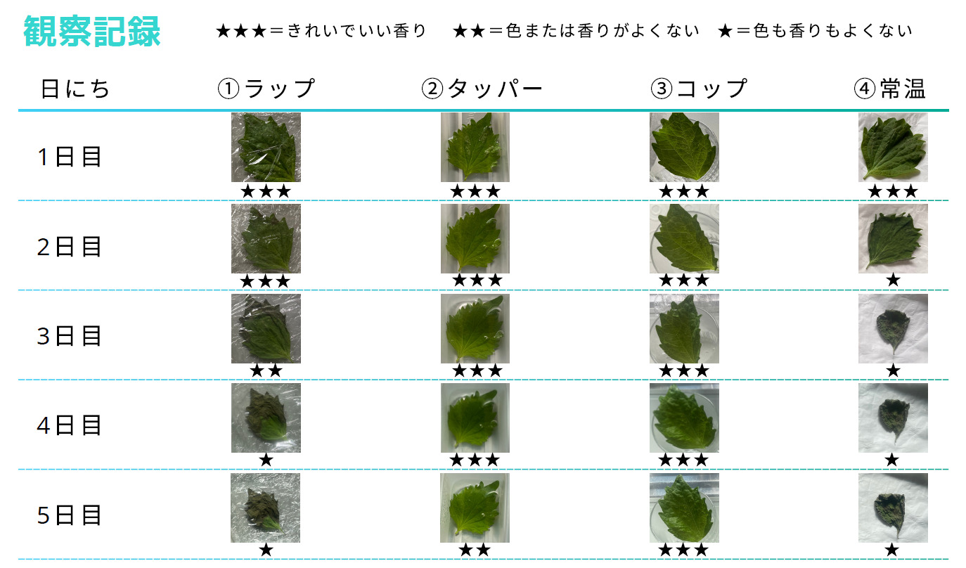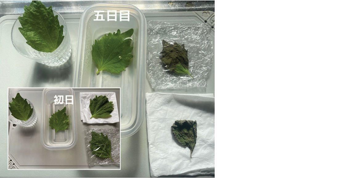 いろいろな方法で大葉を保存し、どれが一番長くきれいなまま保てるかを調べてみることにしました。